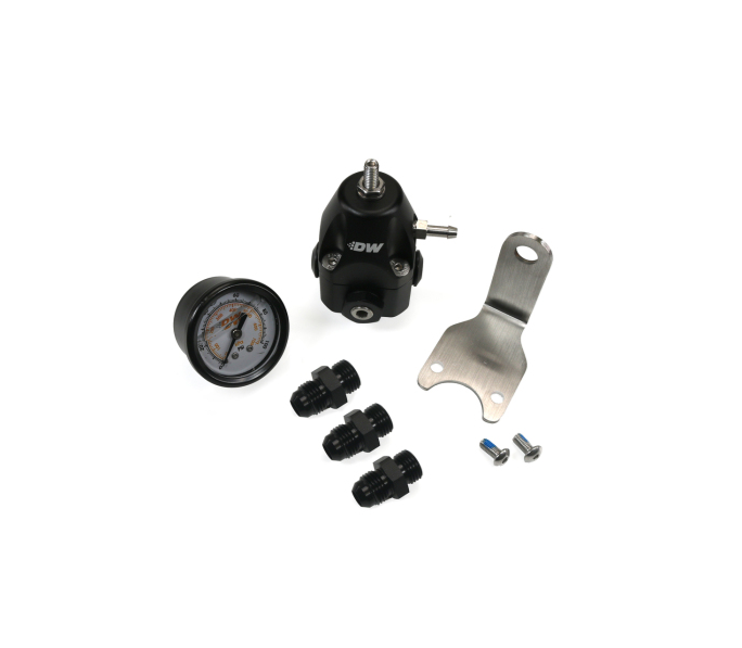 Deatschwerks DWR1000c Adjustable fuel pressure regulator + pressure gauge + (2) 6AN feed & (1) 6AN return fittings, anodized black. Universal fitment.