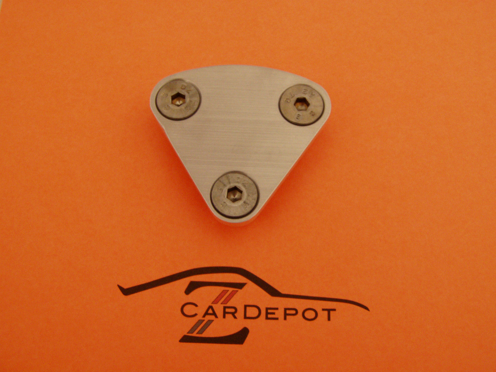 New Billet aluminum block off plate with O-ring seal and "Z" logo. New design with O-ring seal so that no gasket or sealer is required. Includes 3 stainless steel flush mount allen bolts and O-ring. This plate is used to cover the hole left in the cylinder head when the fuel pump has been removed or on 280Z/ZX can be used to clean up the look where the fuel pump or power steering was mounted.