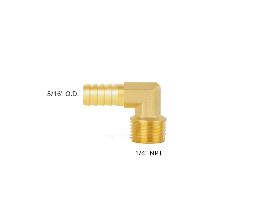 Elbow fittings to connect 1/4" NPT to 5/16" hose barb. 90 degree angle.